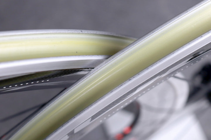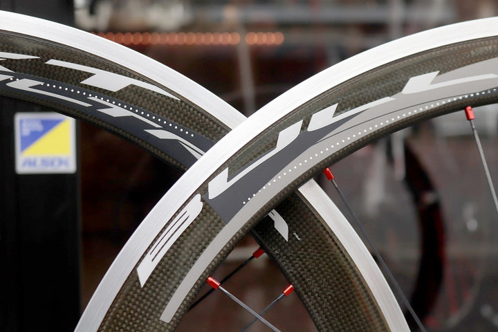 カーボンラッピングにより、50mmハイトのアルミホイールとしては比較的軽い仕上がり。