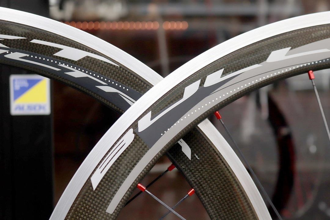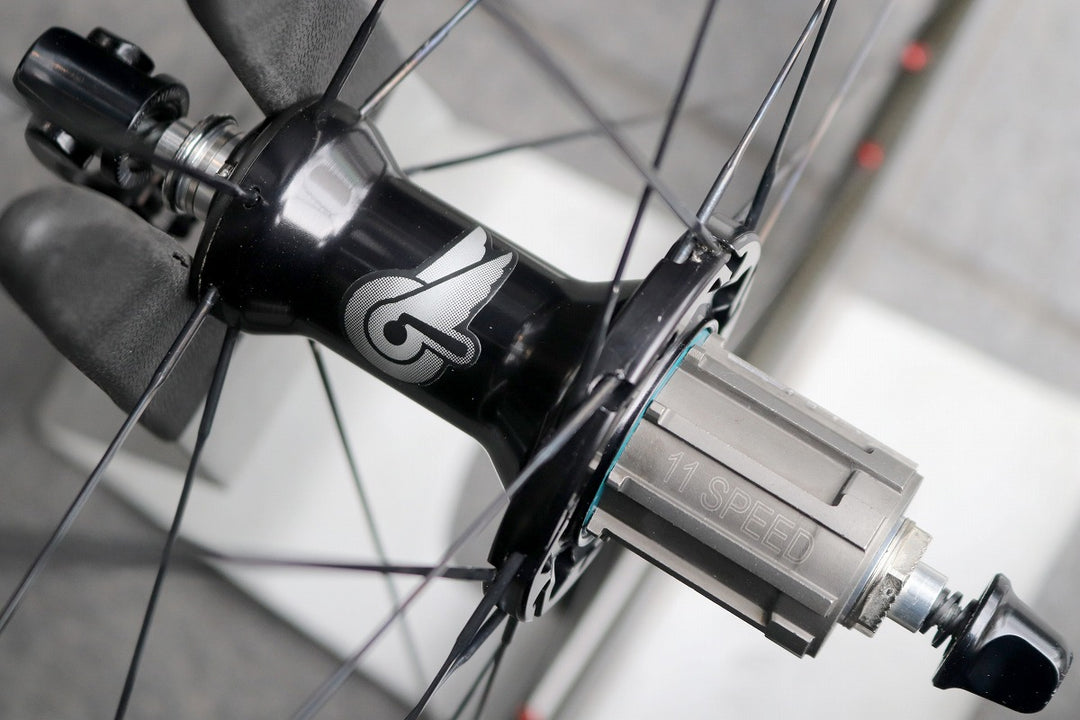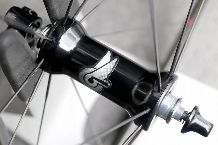 アルミリム表面をカーボンでラッピングした構造の、ディープリムホイールです。